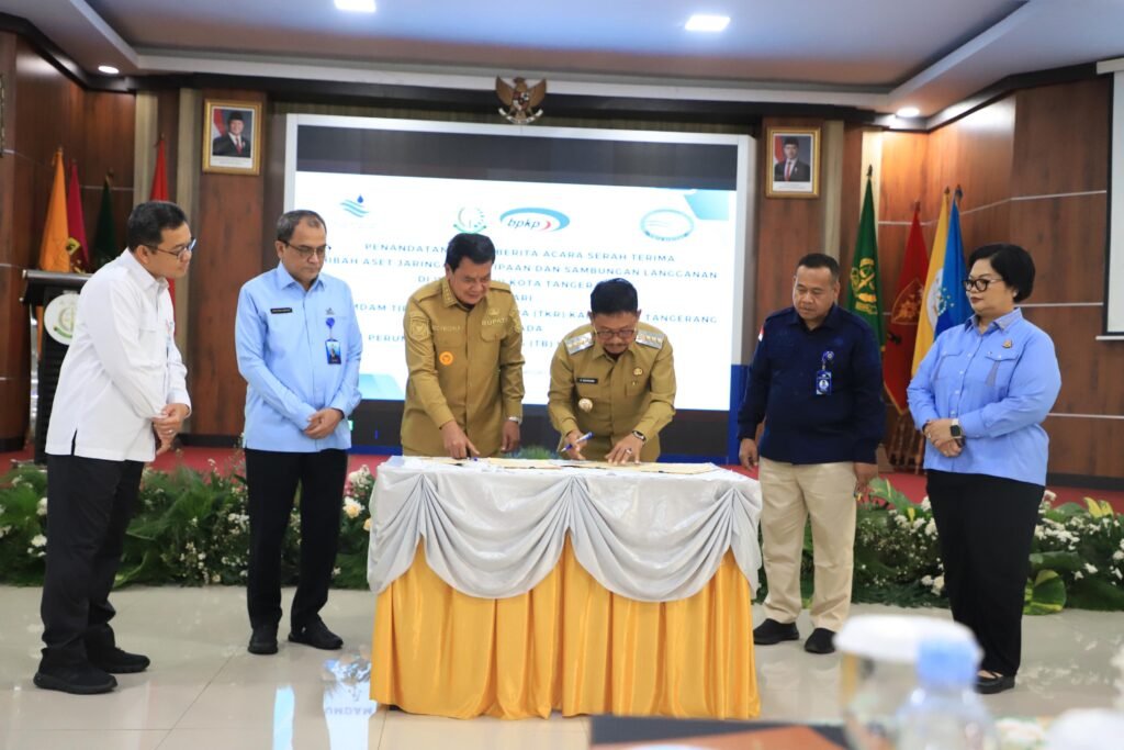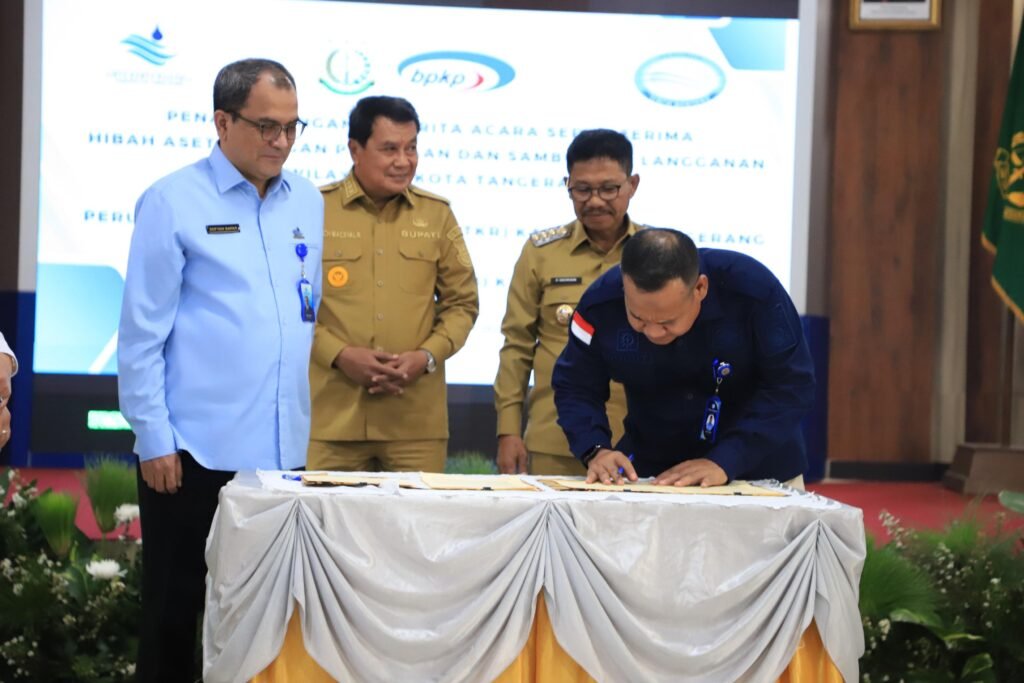 SERANG – Seluruh pelayanan air bersih di wilayah Kota Tangerang kini resmi dilayani oleh PERUMDA Tirta Benteng Kota Tangerang. Hal tersebut menyusul rampungnya proses serah terima hibah aset jaringan perpipaan dan sambungan langganan dari PERUMDAM Tirta Kerta Raharja (TKR) Kabupaten Tangerang.