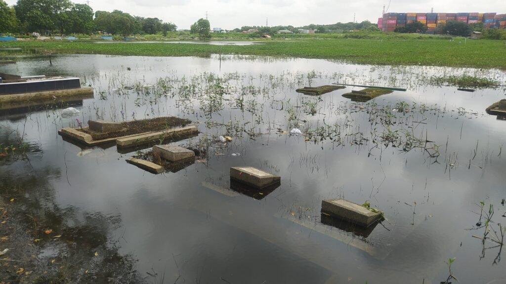 Kondisi ini diperparah dengan letak area TPU yang diketahui berada sekitar satu meter lebih rendah dari wilayah sekitarnya. Selain itu, sistem saluran drainase yang belum optimal membuat air hujan sulit mengalir keluar dari area pemakaman.